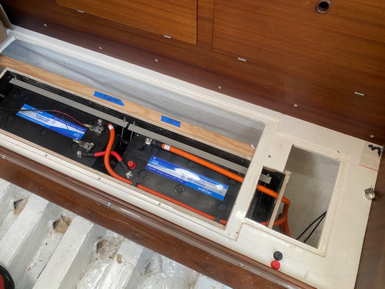 At the beginning of 22, battery technology was facing lengthy lead times, so a Lead AGM battery was selected, this was available within the time frame but also fitted with the low spend goal we were working to. 4 x 12V200ah batteries were chosen and fitted nicely beneath the salon bunks down below. This pack delivers approx. 10Kwh total and 5-7Kwh usable. Plenty enough for the very sailing experienced owner. After all this is a saling boat…!